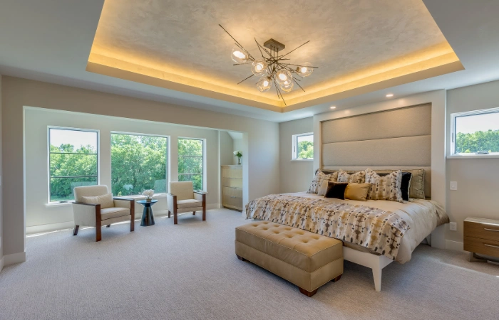 If space permits, adding a seating area is a fantastic luxury bedroom design idea. This can be a simple nook with a couple of comfortable chairs and a small table or a more elaborate setup with a sofa and ottomans. It’s a perfect spot for reading, relaxing, or enjoying morning coffee, enhancing the overall functionality and luxury of the room.