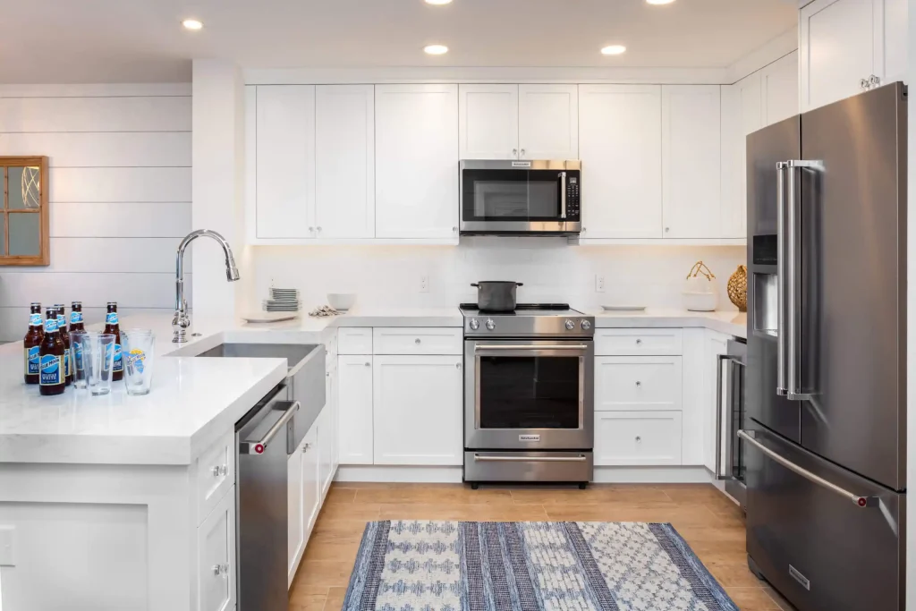 Flooring options like light-colored hardwood, polished concrete, or large-format porcelain tiles work well in a white kitchen. These materials provide a sleek, uniform appearance that complements the minimalist aesthetic. Ensure the flooring is durable and easy to clean to maintain the kitchen’s pristine look.